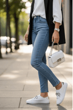 Para um look casual e estiloso, combine o Tênis Moleca Flow com uma calça jogger de moletom, uma blusa cropped canelada e uma jaqueta jeans oversized. Acessórios como uma bolsa transversal minimalista e brincos pequenos dourados completam o visual. Perfeito para um passeio ou encontro descontraído, unindo conforto e sofisticação!