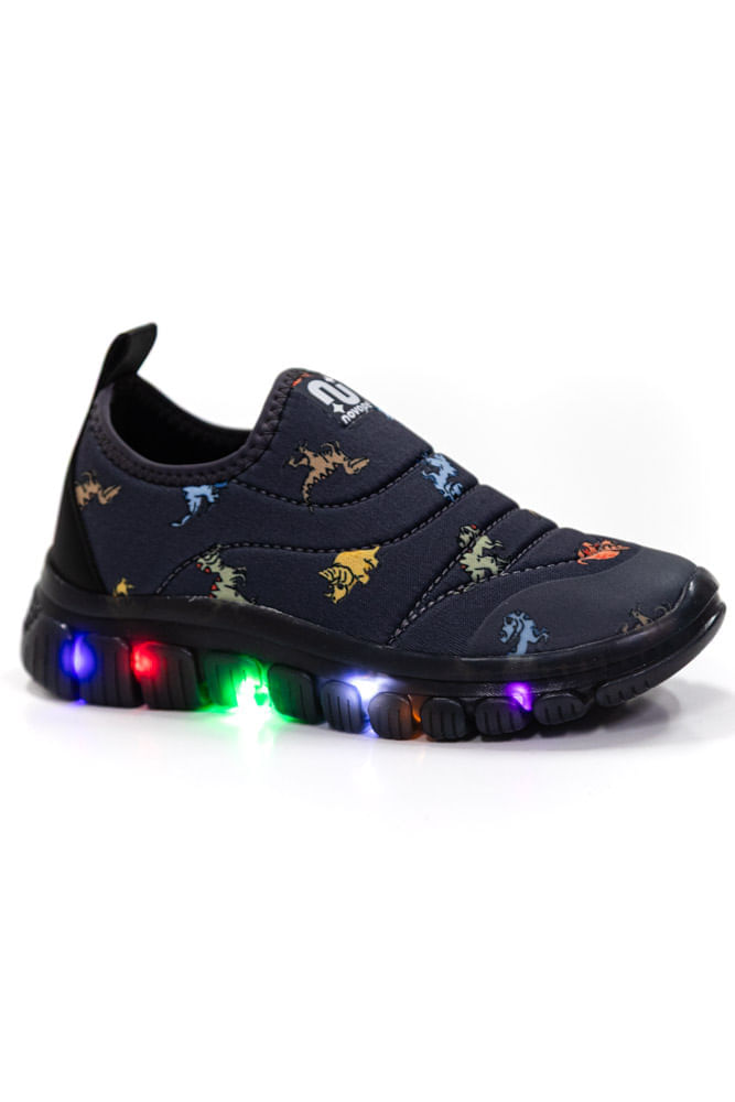 O Tênis Novopé Slip On Infantil Menino Luz Led 99001283-4737 é ideal para acompanhar a rotina ativa dos pequenos com conforto e diversão. Pertencente à categoria tênis infantil casual, possui cabedal em material têxtil sintético acolchoado, resistente e leve, com estampa lúdica de dinossauros que estimula a imaginação. A sola em material sintético emborrachado garante aderência e estabilidade, além de contar com luzes em LED multi coloridas que piscam a cada passo, tornando o caminhar mais divertido. O bico arredondado oferece liberdade aos dedos, enquanto o fecho slip on, sem cadarços, facilita o calce rápido e prático. O colarinho macio e baixo, aliado à palmilha confortável, proporciona bem-estar durante todo o uso. A calcanheira estruturada auxilia no suporte do pé, e o acabamento interno suave evita atritos. Um tênis funcional, seguro e cheio de estilo, perfeito para brincar, passear e se movimentar com alegria.