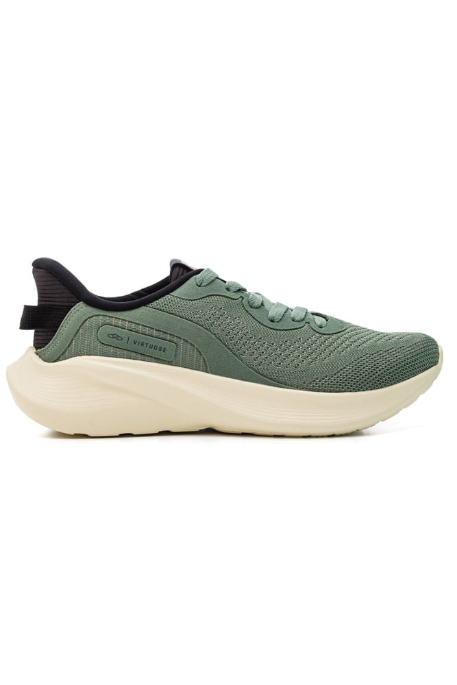 O Tênis Olympikus Virtuose Masculino Caminhada Militr traz cabedal em Hypersox, tecido em malha com estrutura similar à meia, leve, anatômico e flexível. Conta com gáspea em Eco Suede para suporte e biqueira embutida. O fechamento é em cadarço tradicional com atacador de poliéster e lingueta em tecido canelado com espuma. A construção é tipo meia, slip-on com amarração e o colarinho é acolchoado para conforto. A palmilha é em EVA, respirável e anatômica; a calcanheira é reforçada. O forro interno é de poliéster macio. O solado é de EVA com a tecnologia Eleva+, que garante amortecimento trampolim, absorção de impacto responsiva e ótimo retorno de energia. A entressola também é em EVA expandido Eleva+, com bom grip e tração em pisos secos. Possui puxador traseiro em fita. O estilo da peça é esportivo casual, com design moderno e detalhe canelado na lingueta.