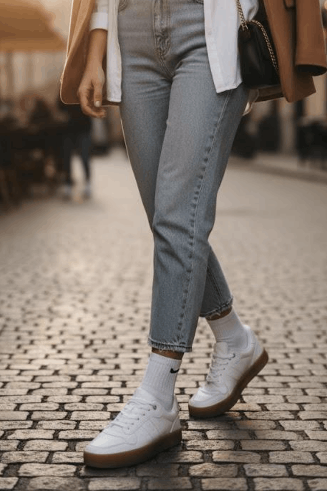 Para um passeio descontraído ou um café com amigas, combine o Tênis Sua Cia Casual com uma calça jeans larga de cintura média, cropped canelado off-white e uma jaqueta oversized de sarja bege. Finalize com bolsa tiracolo estruturada e acessórios dourados minimalistas. Um look urbano, confortável e cheio de estilo, ideal para se destacar sem esforço.