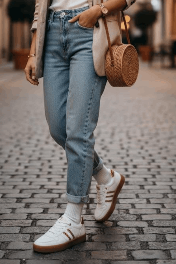 Para um passeio descontraído ou um café com amigas, combine o Tênis Sua Cia Casual com uma calça jeans larga de cintura média, cropped canelado off-white e uma jaqueta oversized de sarja bege. Finalize com bolsa tiracolo estruturada e acessórios dourados minimalistas. Um look urbano, confortável e cheio de estilo, ideal para se destacar sem esforço.