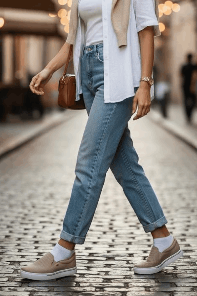 Para um passeio de domingo, combine o slip on Via Marte com vestido midi floral e jaqueta jeans clara. Acrescente uma bolsa tiracolo em tom neutro e óculos de sol. O tênis em napa creme traz leveza ao visual, além de conforto para caminhar com estilo, ideal para momentos descontraídos sem abrir mão da elegância casual.