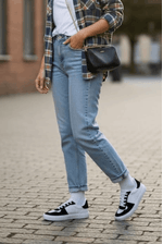 Para um passeio casual, combine o Tênis Yoa Casual com uma calça jeans reta clara e uma camiseta básica de algodão. Acrescente um cardigan oversized ou jaqueta leve para camadas, e finalize com uma bolsa transversal pequena. A combinação une conforto e estilo, permitindo liberdade de movimento, enquanto o tênis em camurça adiciona um toque moderno e sofisticado ao visual.