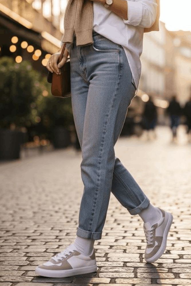 Para um passeio casual, combine o Tênis Yoa Casual com uma calça jeans reta clara e uma camiseta básica de algodão. Acrescente um cardigan oversized ou jaqueta leve para camadas, e finalize com uma bolsa transversal pequena. A combinação une conforto e estilo, permitindo liberdade de movimento, enquanto o tênis em camurça adiciona um toque moderno e sofisticado ao visual.